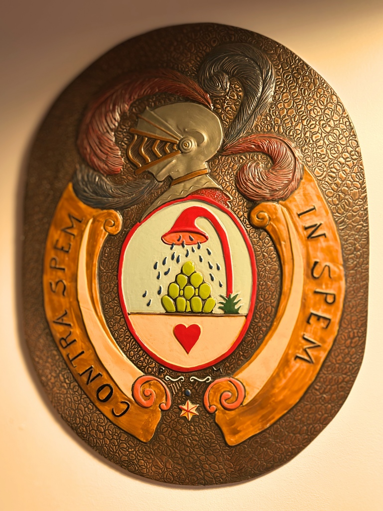 Ces armoiries font partie de notre histoire familiale et ont toujours été la source, entre nous, de plaisanteries peu respectueuses ! En effet ce qui est, littéralement, une corne d’abondance versant de l’eau sur des roses, des fruits et un cœur, a toujours été comparée entre nous à … une douche ! et nous parlions des armoiries d’un plombier !